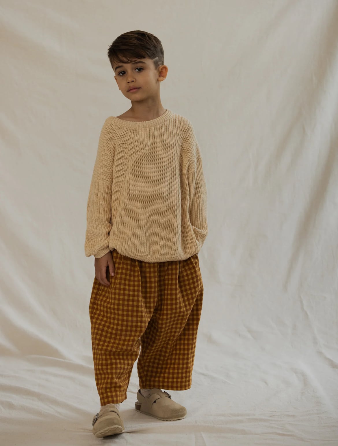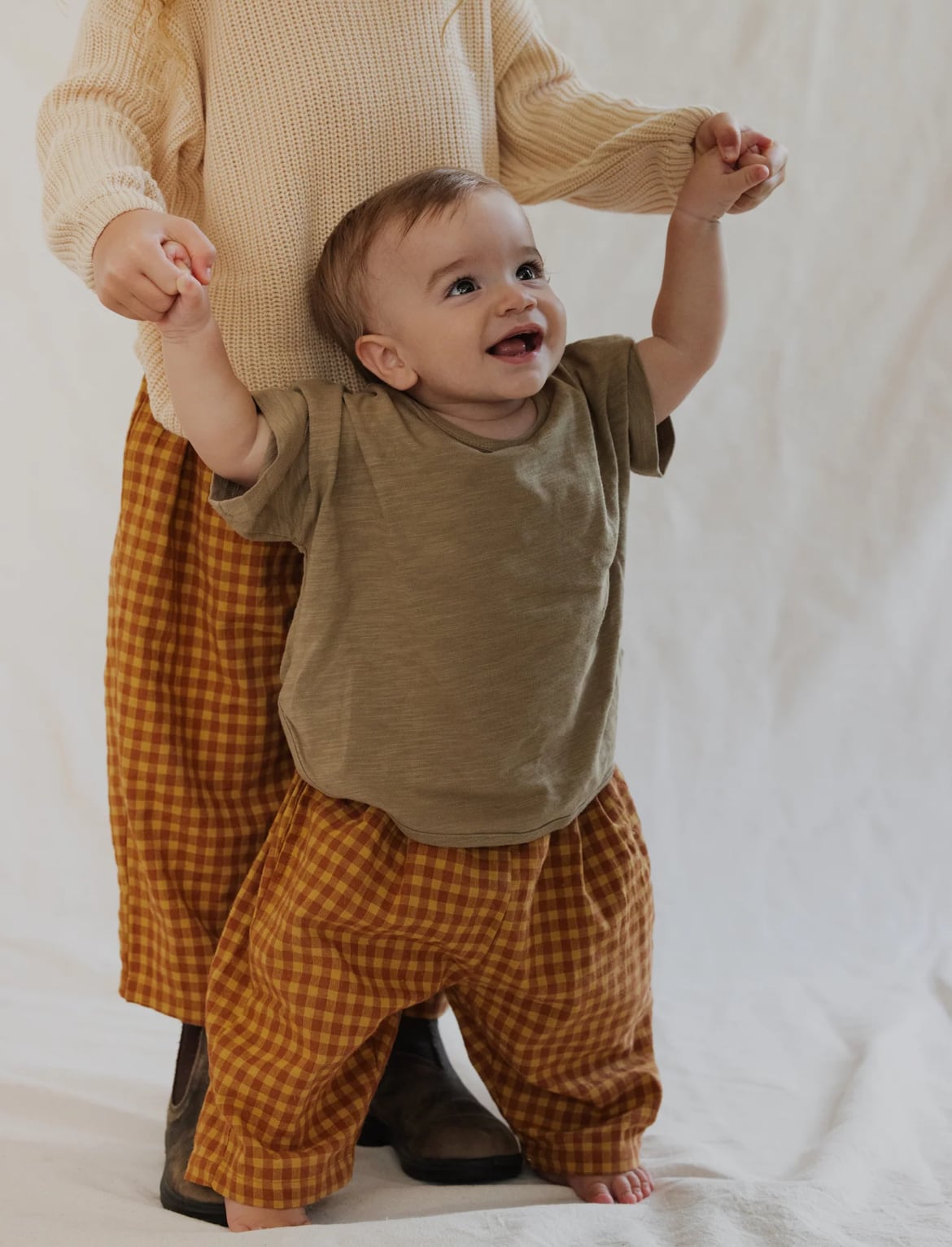 上質な柔らかなコットン素材を使用し、ドロップクロッチとサイドポケットを備えたこの小さなパンツは、スタイリッシュで実用的です。