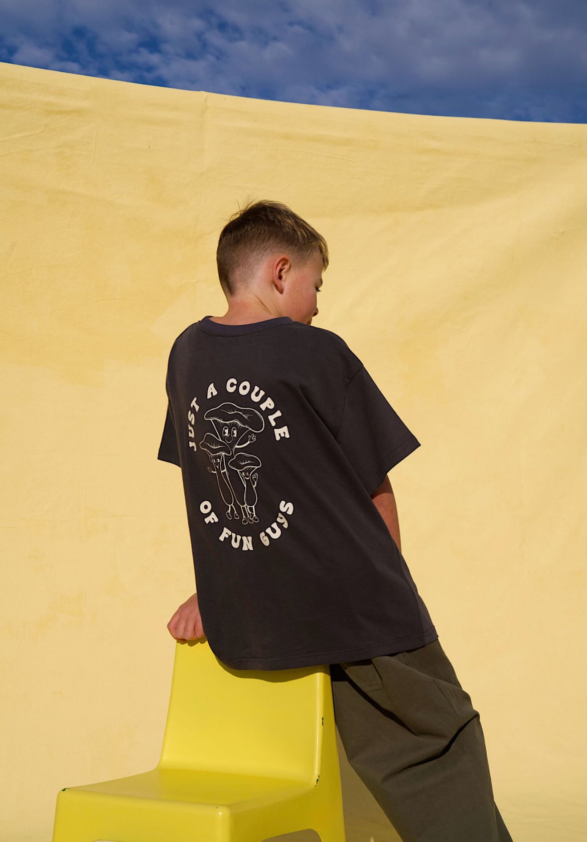 背面には「Just a Couple of Fun Guys」のきのこのグラフィック、前面にはロゴをあしらいました。遊び心があり、耐久性も抜群で、着回し力も抜群です。