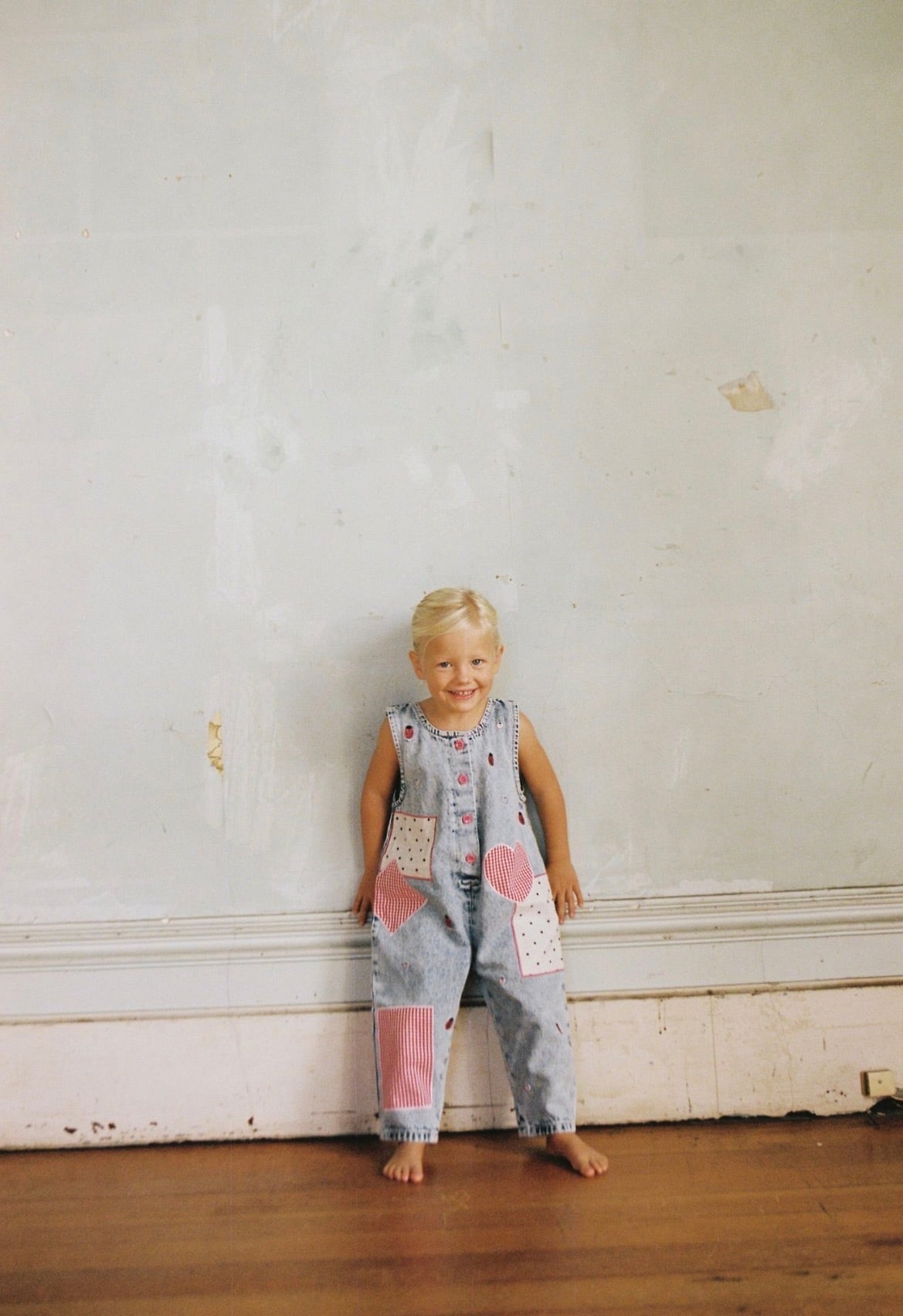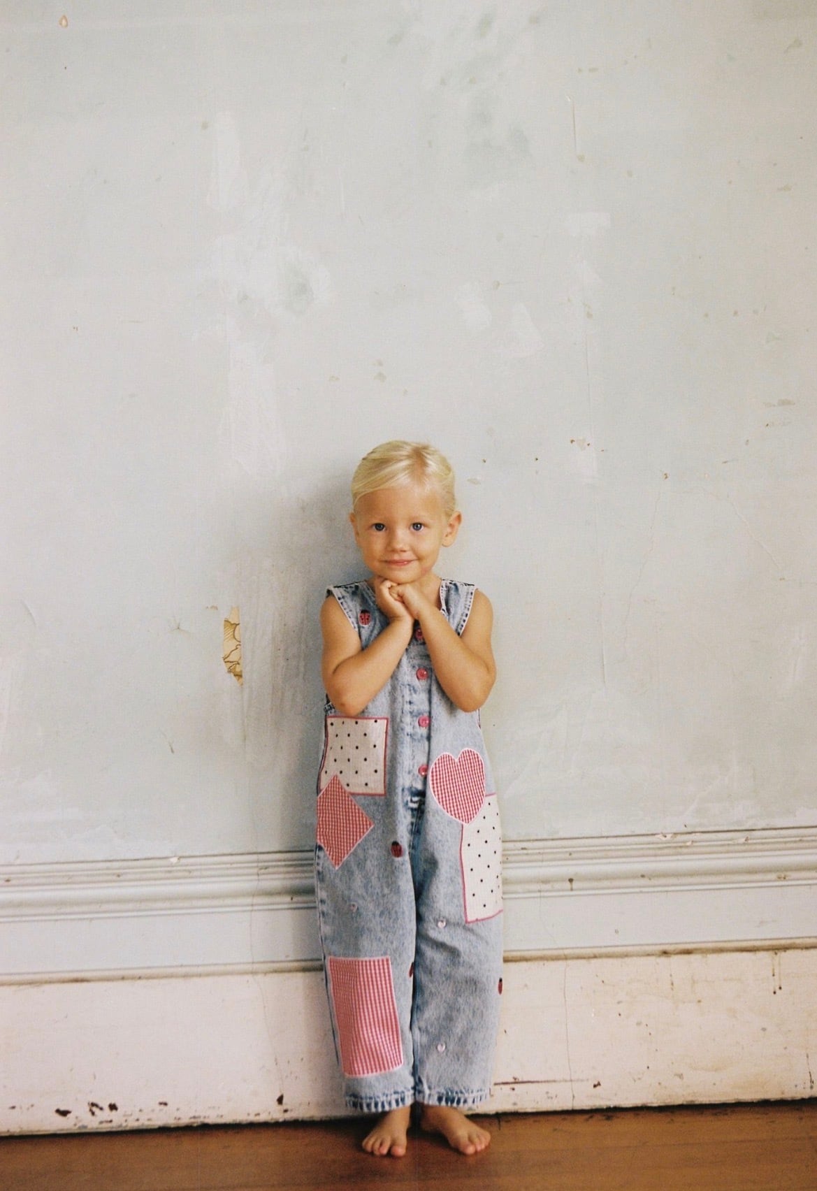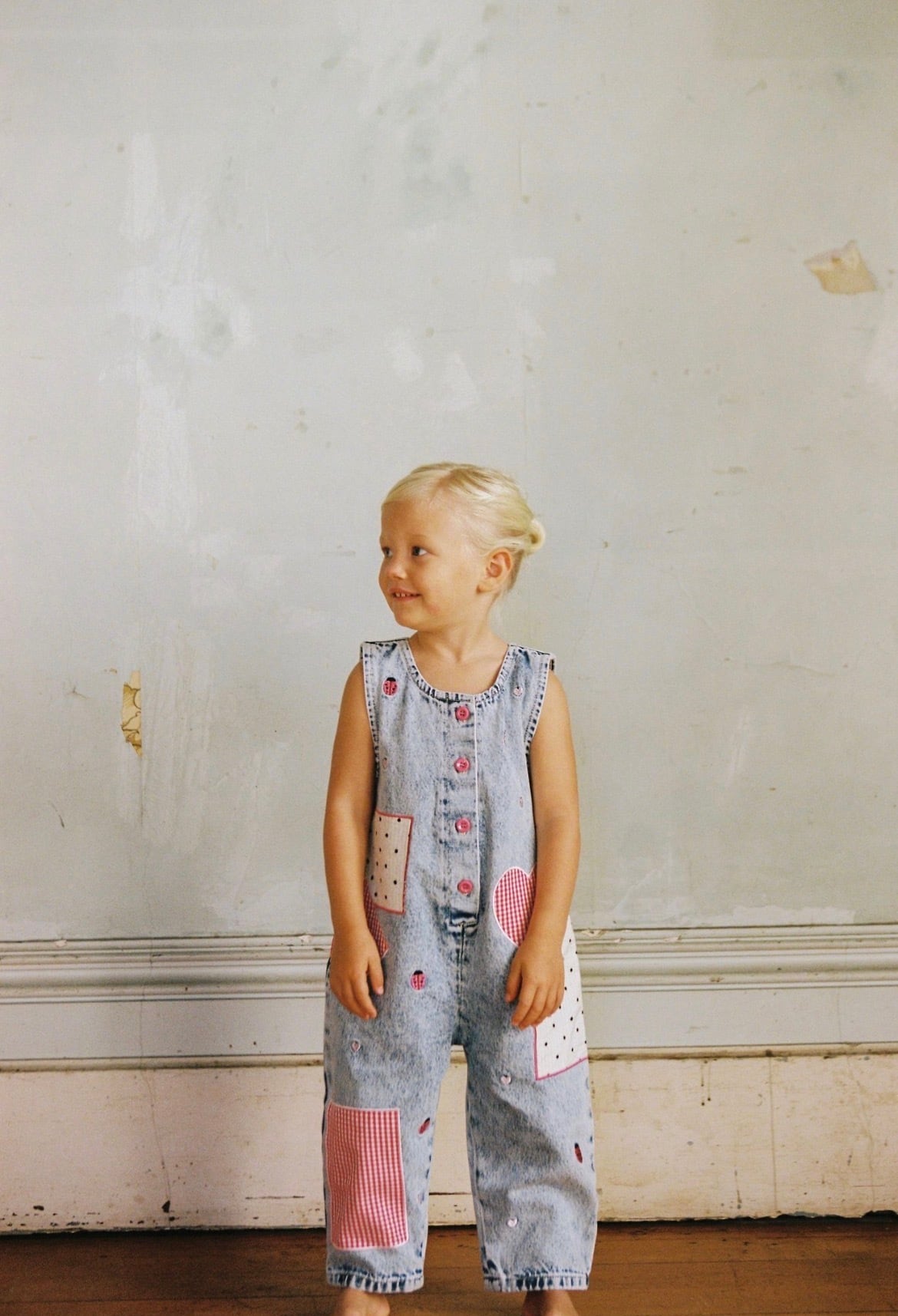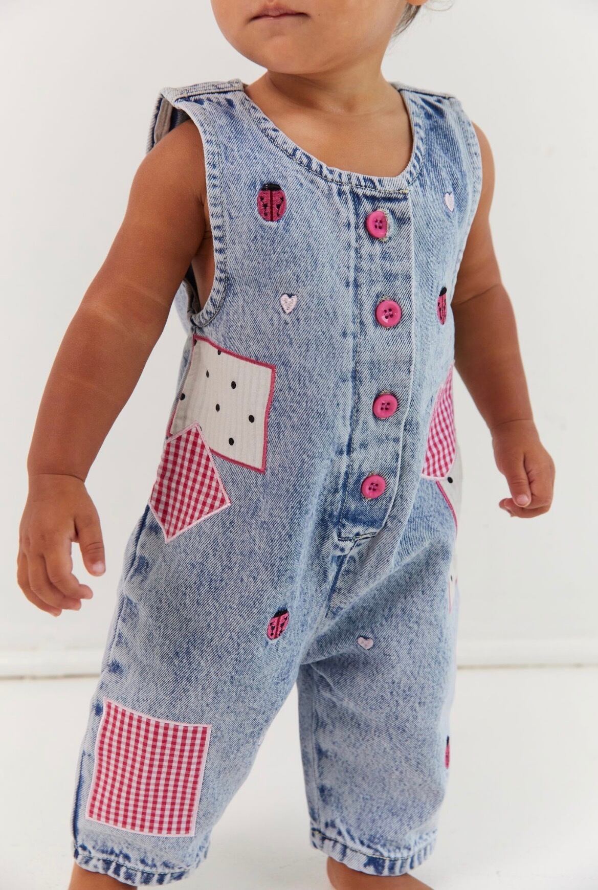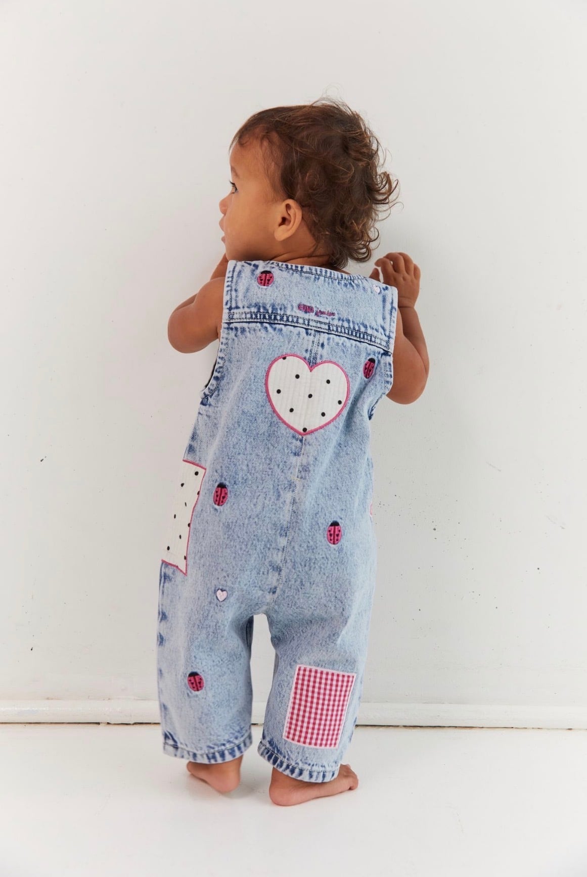 てんとう虫の刺繍、パッチワークデザインがポイント。機能的なボタン、ミッドウォッシュデニム加工が施されています。